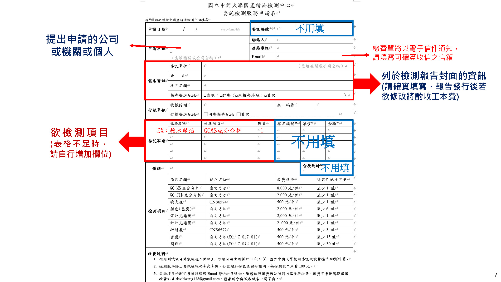 委託項目檢測完畢後將透過Email寄送繳費通知,煩請依照繳費通知所列內容進行繳費,繳費完成後本單位將會寄出紙本報告及發票。